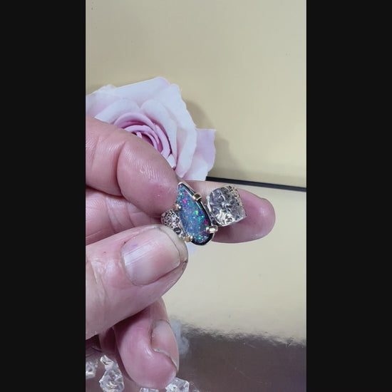 This Black Opal Doublet Ring "Stardust" features a stunning 10mm x 6mm black opal doublet set securely in 9ct gold claws, highlighting its vibrant play of colors. The 10mm wide sterling silver band boasts a unique rough, organic texture, lending an artisanal character to the piece. Sized at 8½, this ring combines expert craftsmanship with striking natural beauty, offering a captivating accessory that reveals its true allure only when worn.