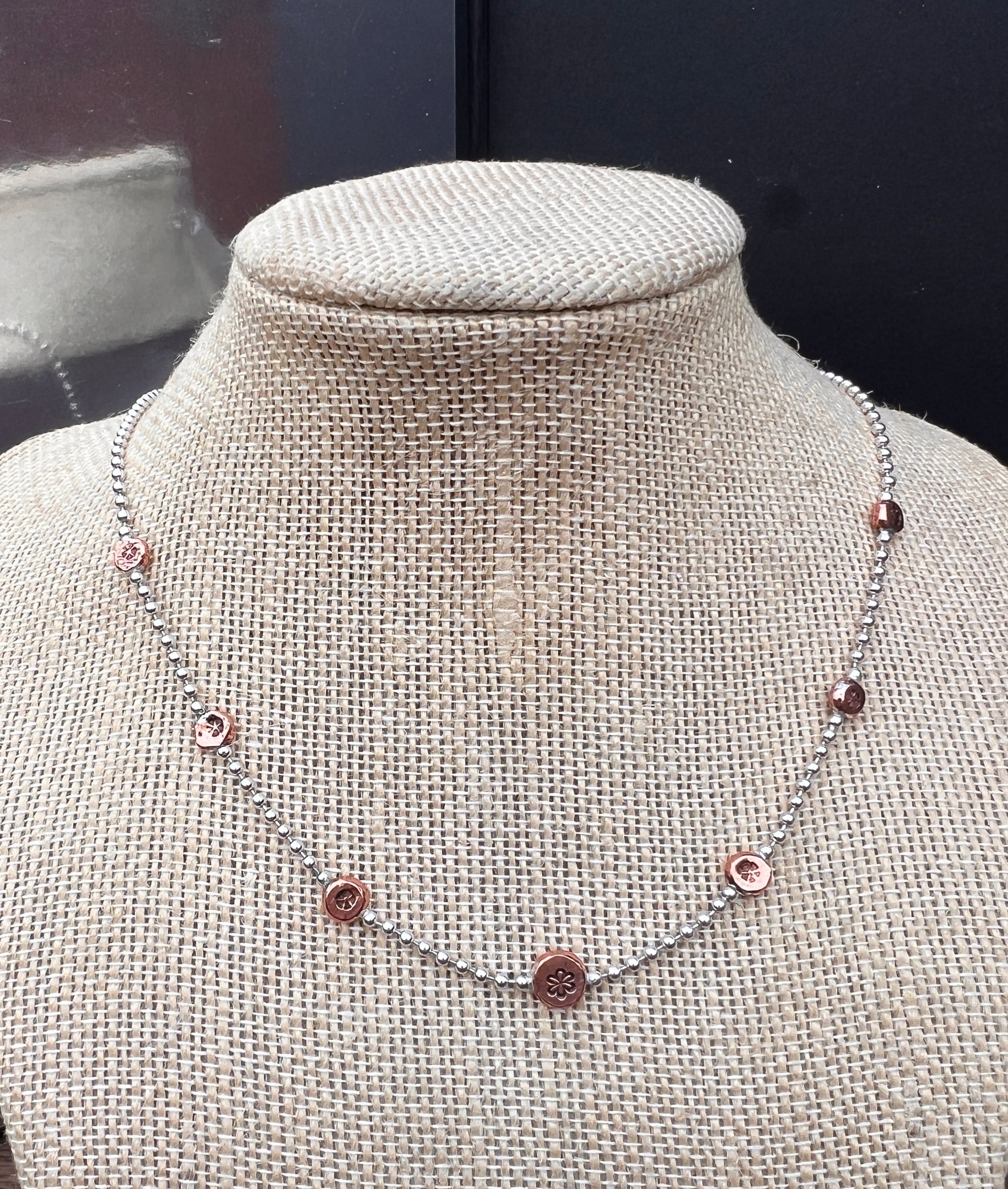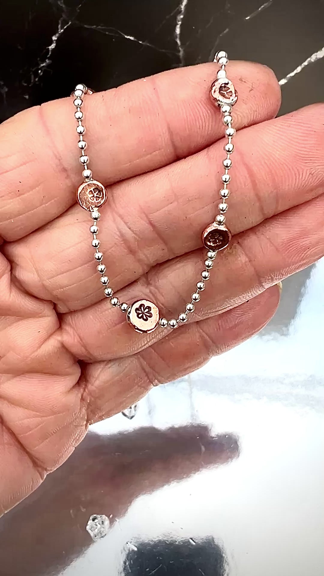 This lovely necklace is created with 2mm wide sterling silver ball chain with 5-7mm wide hand forged, hand stamped copper discs.