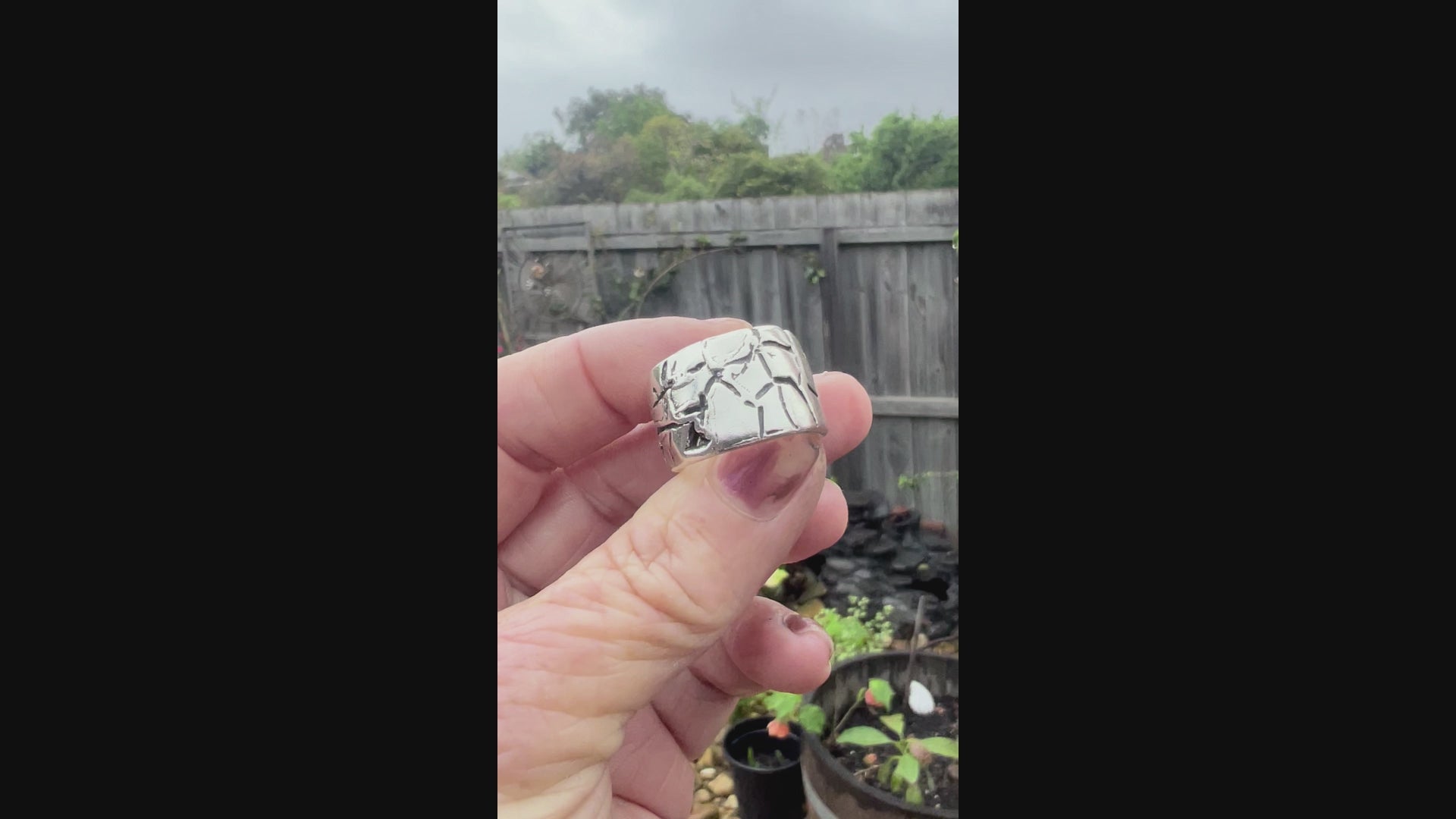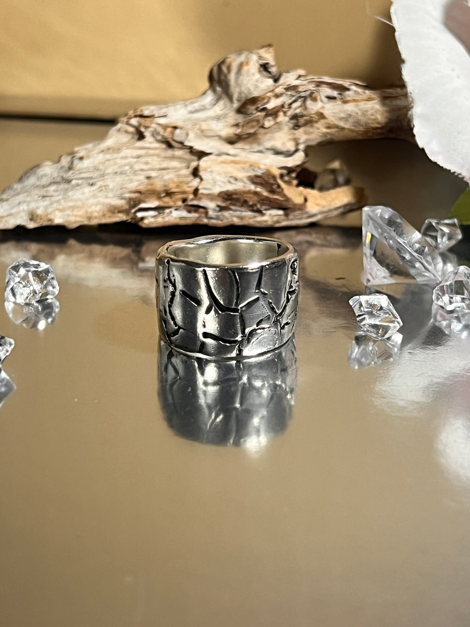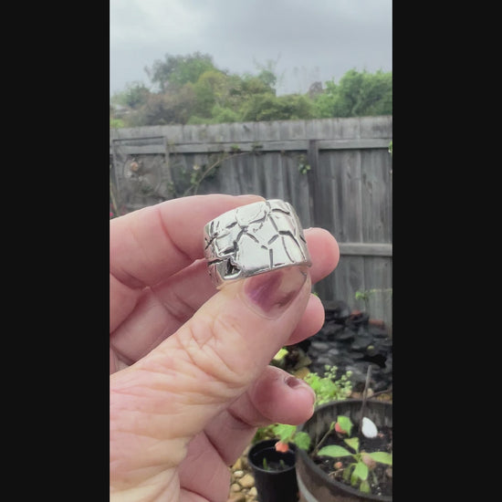 This striking sterling silver ring draws inspiration from the parched landscapes of Australia's drought-stricken riverbeds, capturing the raw beauty of cracked earth in its textured design. Crafted from premium sterling silver and measuring 15mm in width, it makes a bold statement piece that celebrates the resilience of nature. Sized at 8½, this substantial ring combines artistic storytelling with expert craftsmanship, perfect for those who appreciate jewellery with deeper meaning and distinctive character.