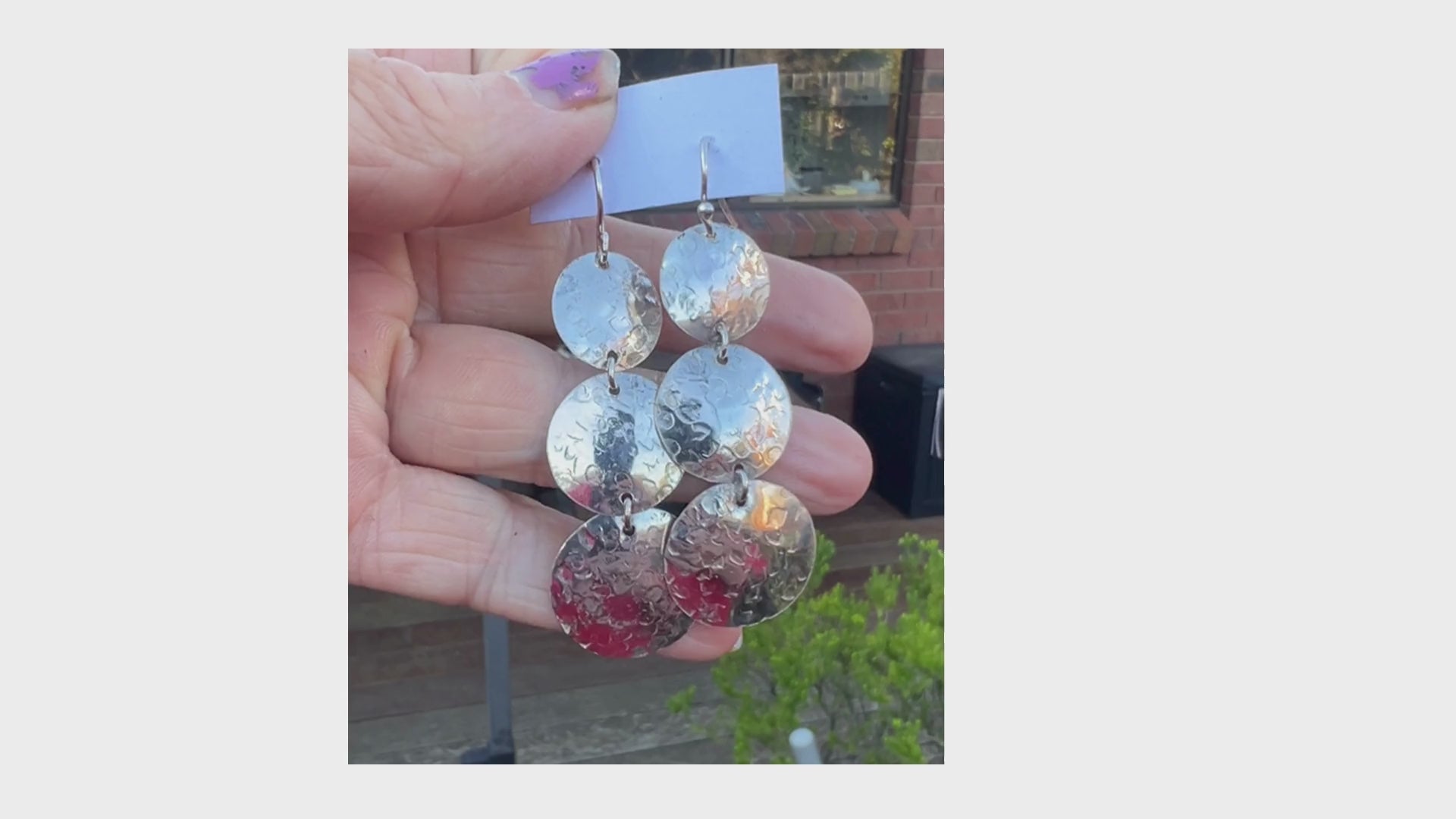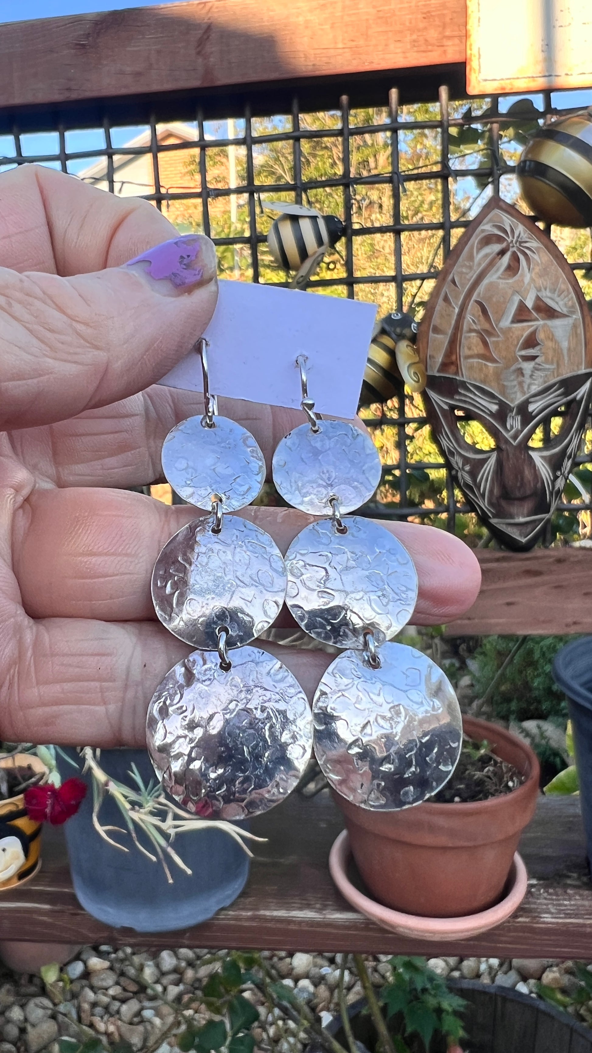 With a textured and domed appearance, these earrings add a modern touch to any outfit. The three graduated discs measure 15mm, 20mm, and 25mm & are on hand forged sterling silver shepherd hooks, creating a drop length of 50mm.