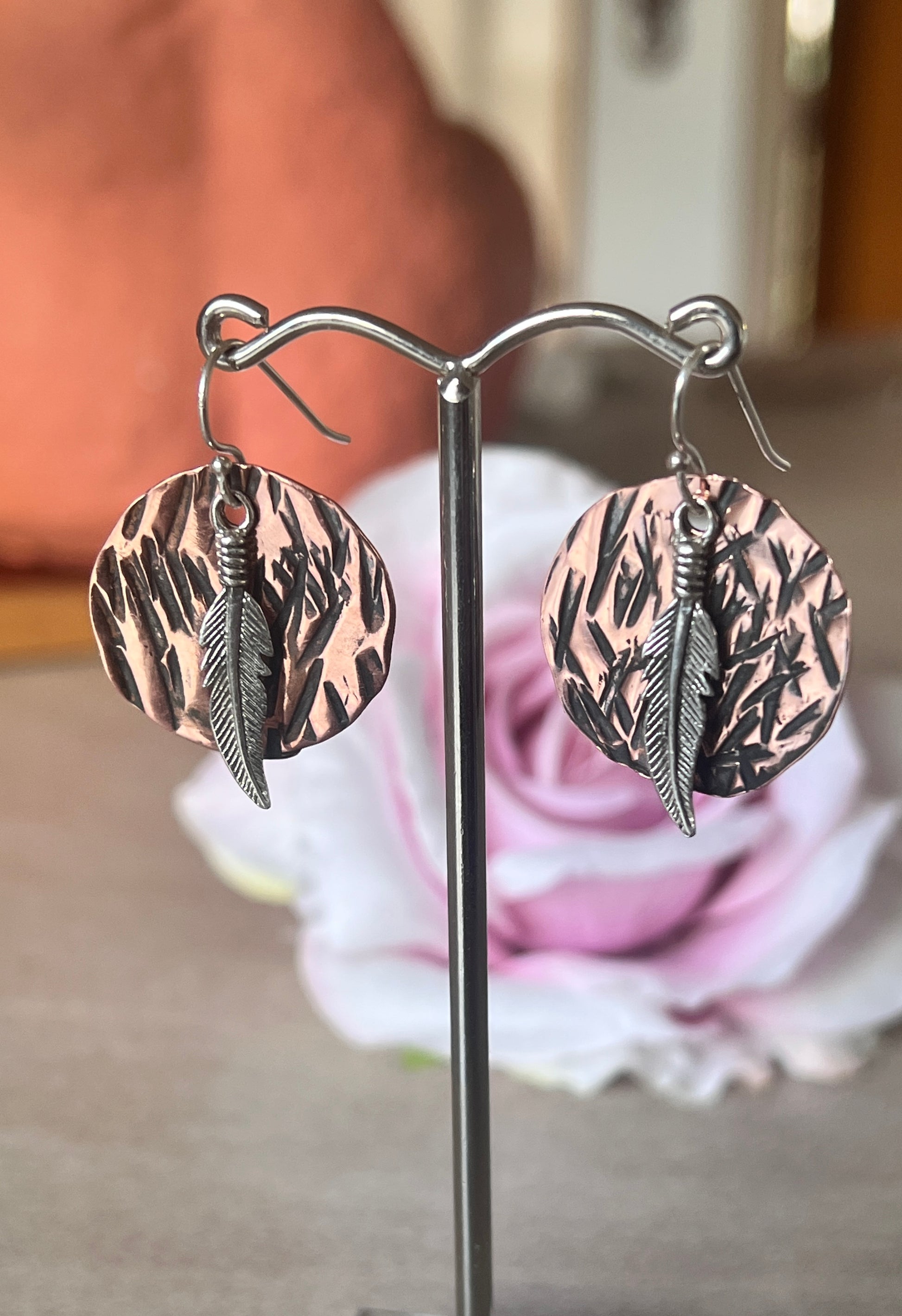 Add a funky twist to your earring collection with these Mixed Metal Earrings! The unique combination of silver and copper creates a playful contrast. One pair features a floral embossed copper disc, another boasts a silver star and moon duo, while the third brings together a textured copper disc and silver feathers.